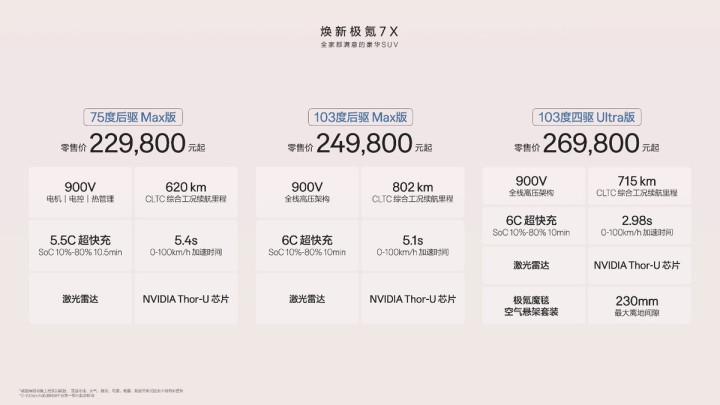 10月28日,焕新极氪7X正式上市,新车共推出75度后驱Max版、103度后驱Max版、103度四驱Ultra版三款配置,官方零售价分别为22.98万元、24.98万元和26.98万元,叠加超级置换权益后,限时售价21.98万元起。
